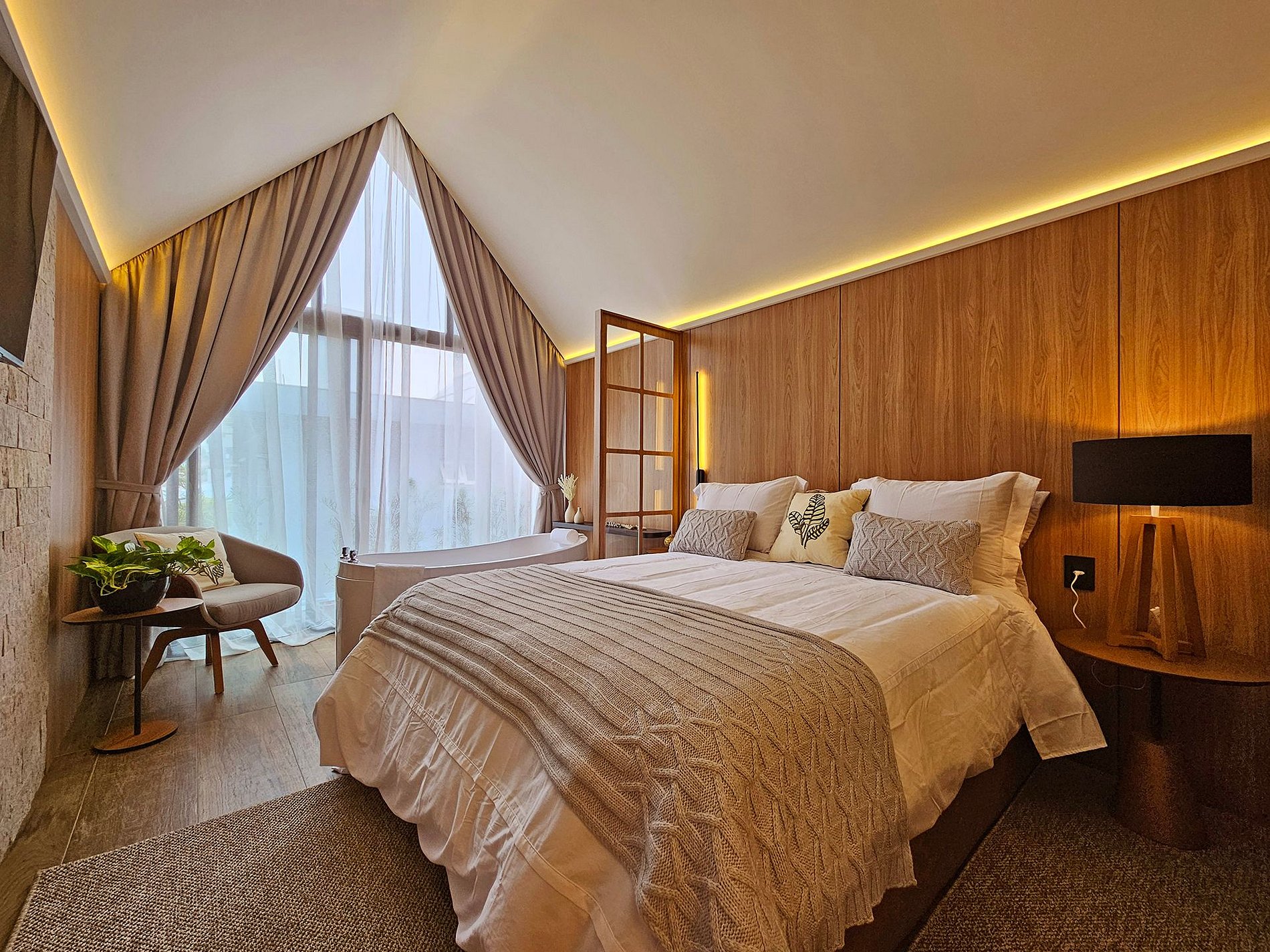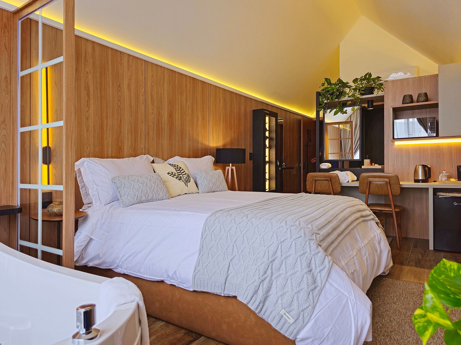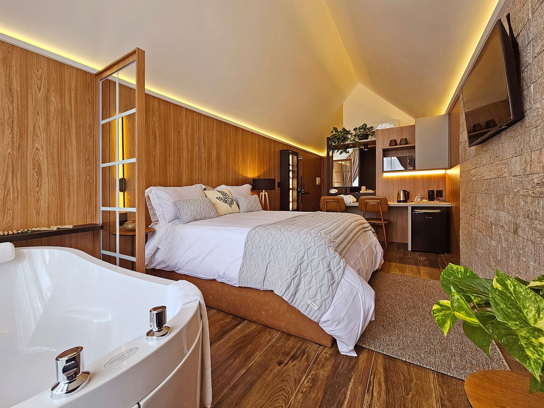 Localizada, a apenas 1km do centro, a cabana Malbec tem um visual interno que mescla o contemporâneo com a rusticidade, o revestimento em pedra na parede transmite um toque de casa antiga da vovó e os painéis de madeira, aquecem o ambiente num visual mais intimista. Na banheira de imersão, a água morna acalme sua mente e tire a tensão do seu corpo, transportando-o para um estado de total relaxamento.