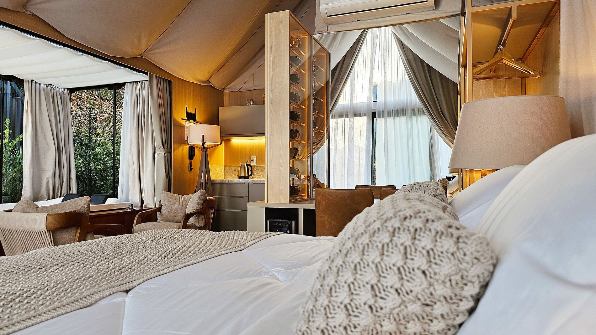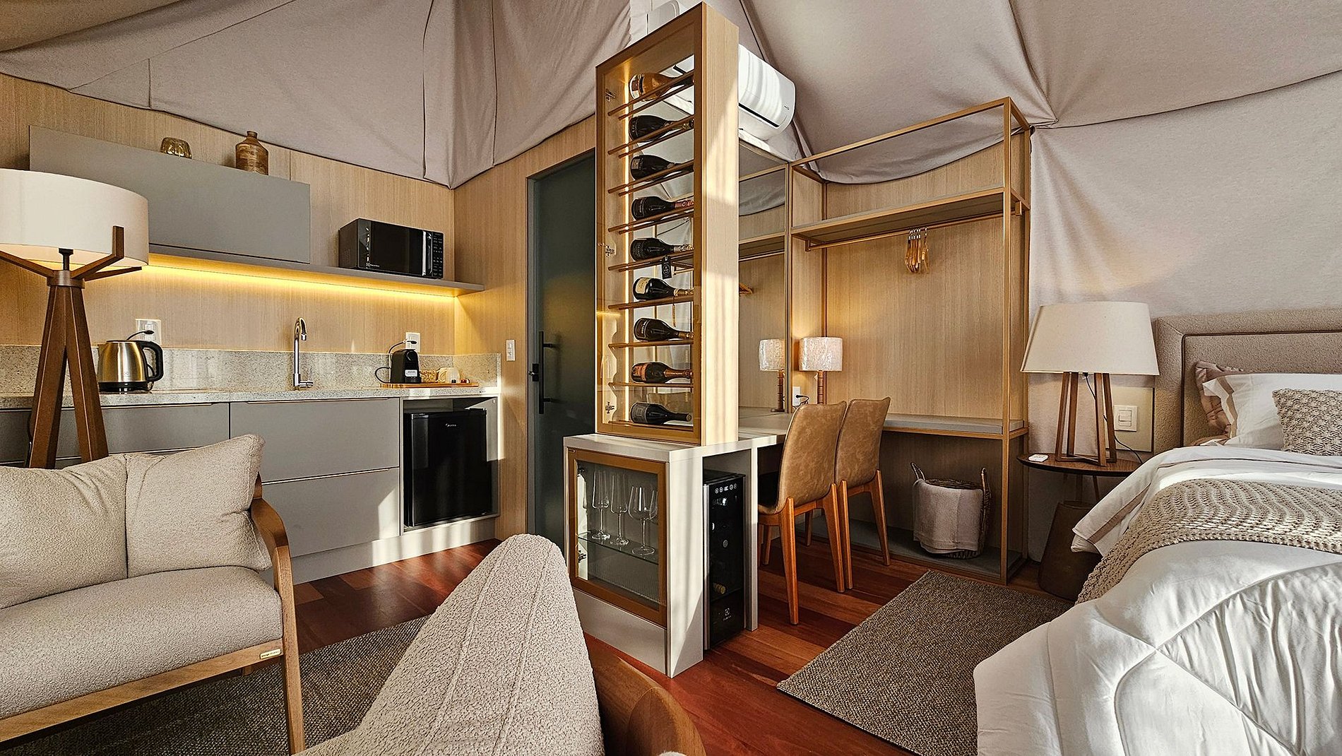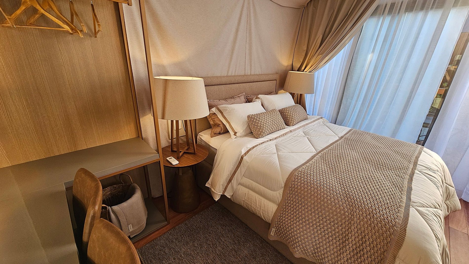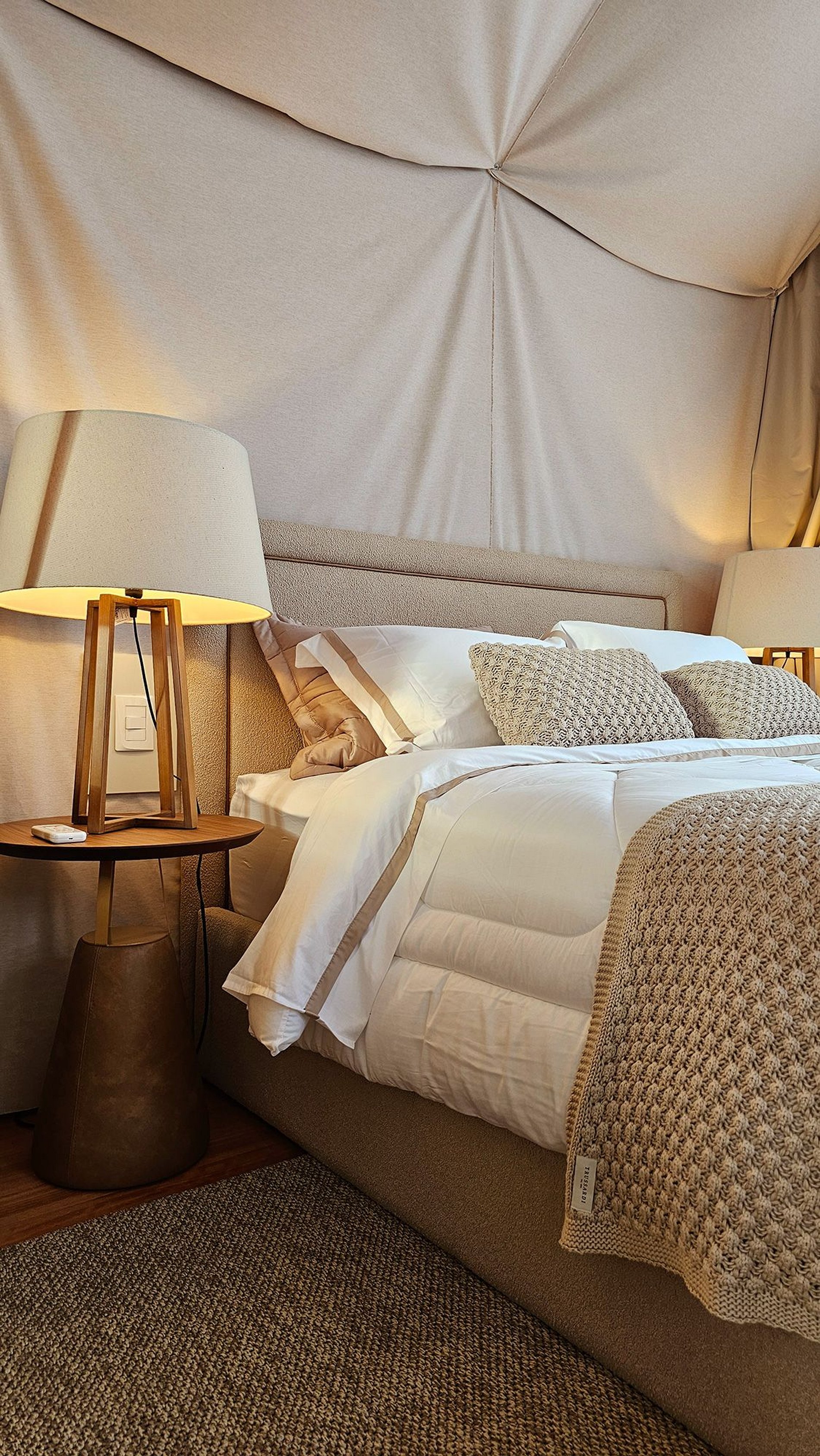 O teto e as paredes são revestidos por um tecido de linho, leve e elegante, que transmite a sensação de estar em uma tenda luxuosa no meio do deserto. A suave luz filtrada através do tecido das cortinas cria uma atmosfera de serenidade, perfeita para relaxar e recarregar suas energias.