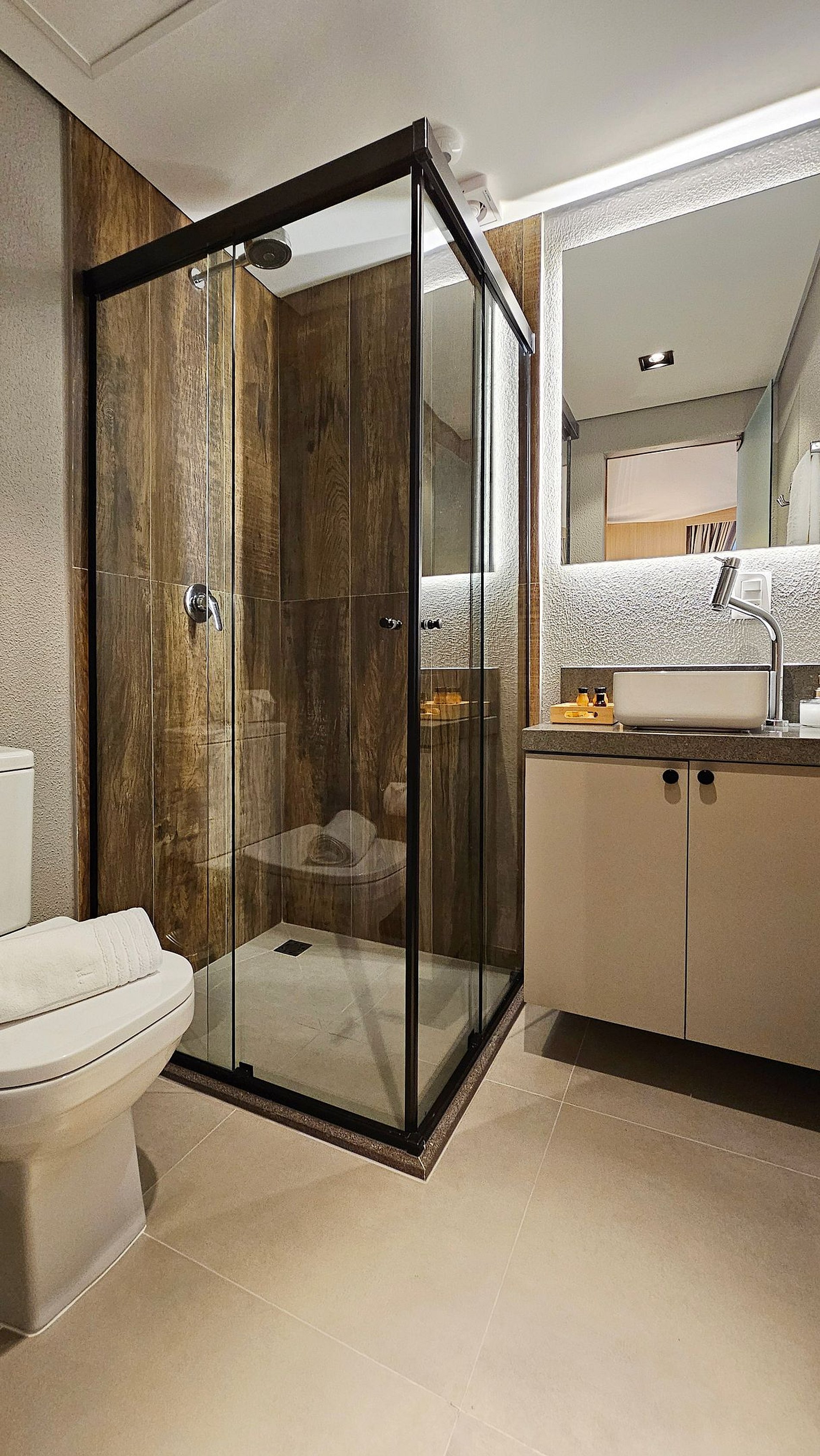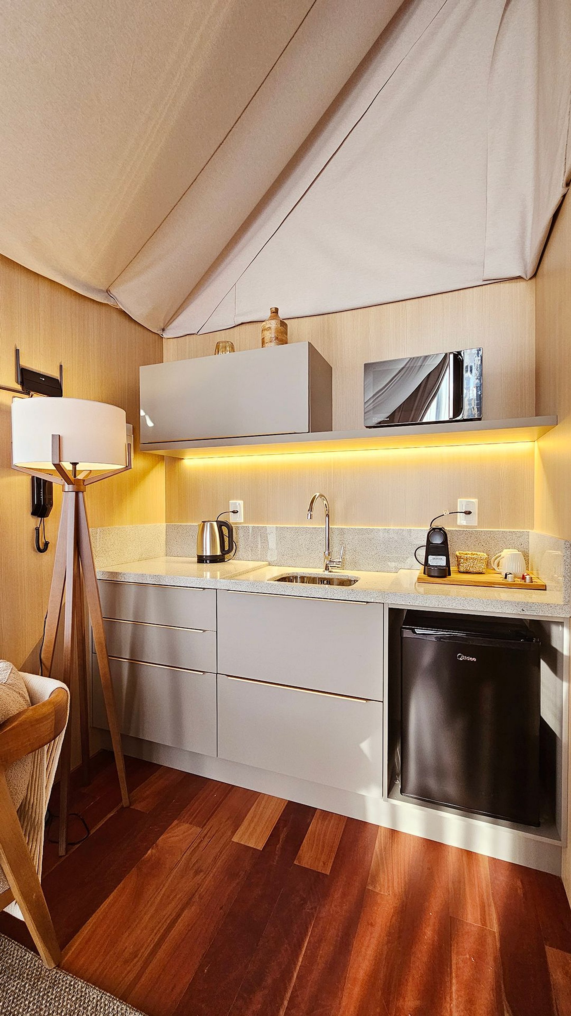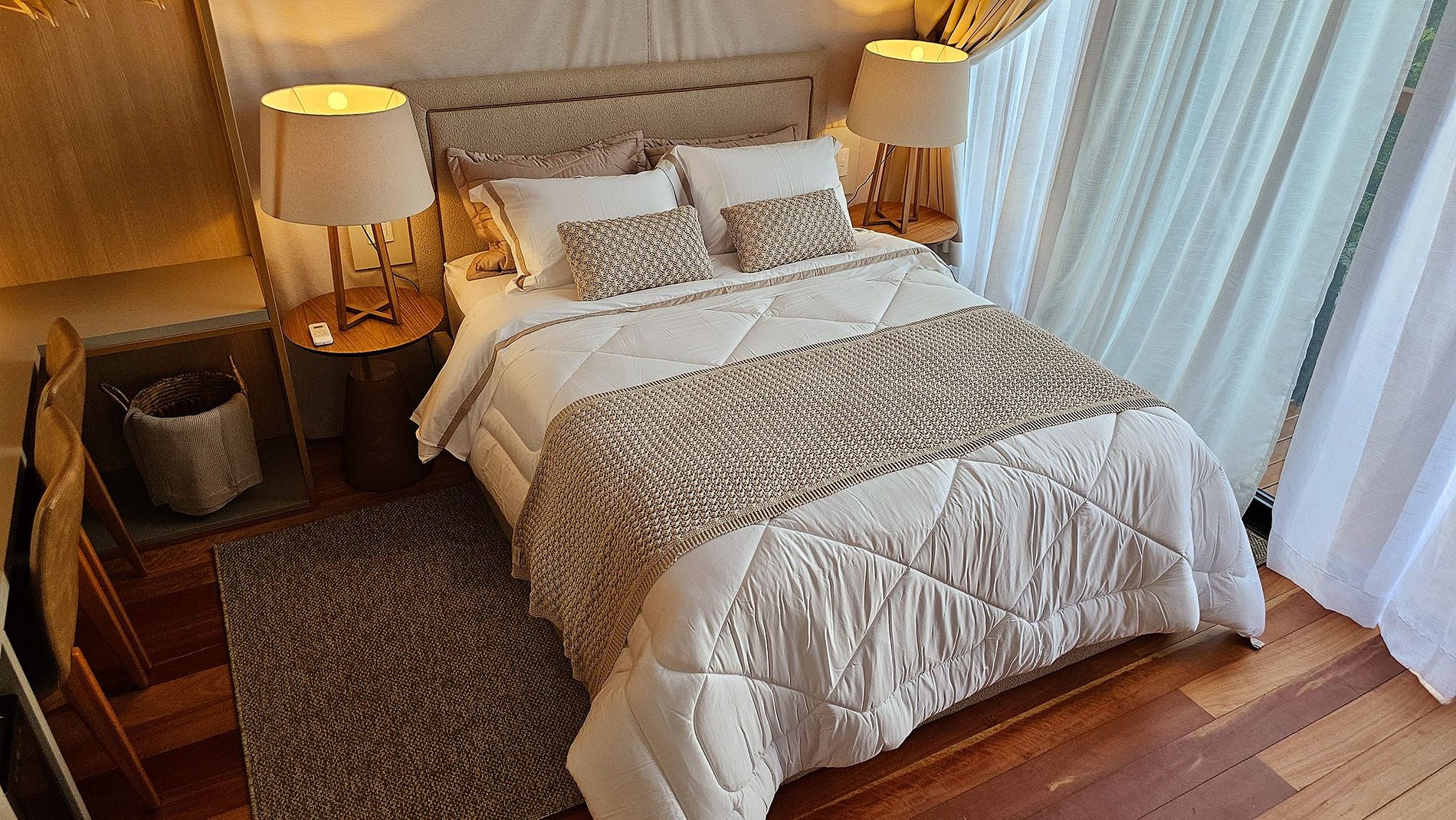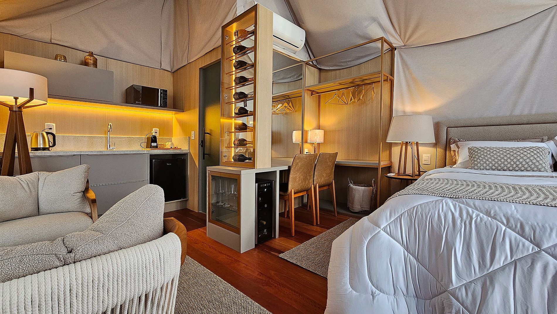 O teto e as paredes são revestidos por um tecido de linho, leve e elegante, que transmite a sensação de estar em uma tenda luxuosa no meio do deserto. A suave luz filtrada através do tecido das cortinas cria uma atmosfera de serenidade, perfeita para relaxar e recarregar suas energias.