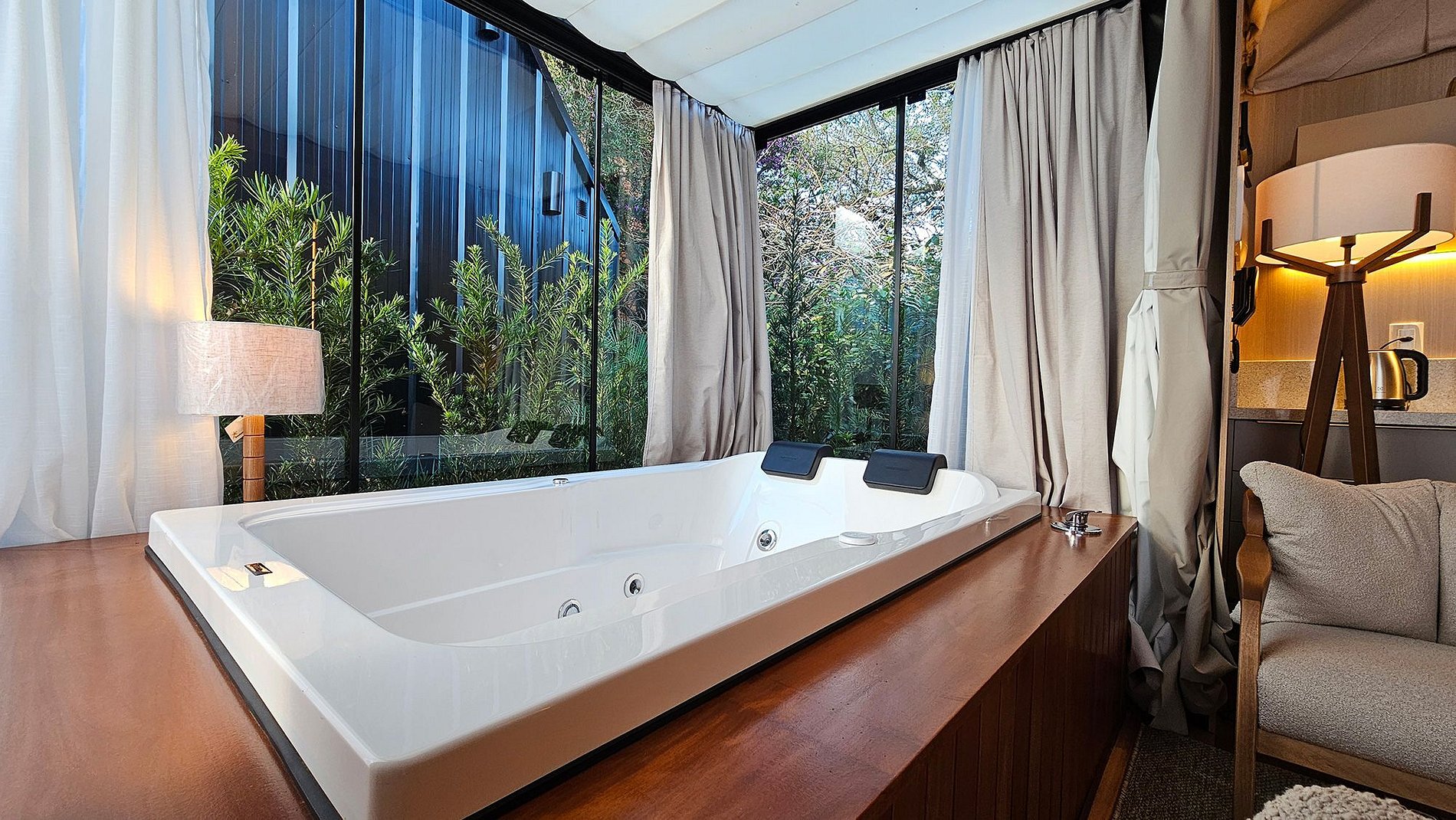 Dentro da cabana, você encontrará a peça central de luxo: uma hidromassagem espaçosa, convidando-o a mergulhar em um oásis de relaxamento. Deixe-se envolver pela água quente enquanto contempla as estrelas através do teto de vidro acima.