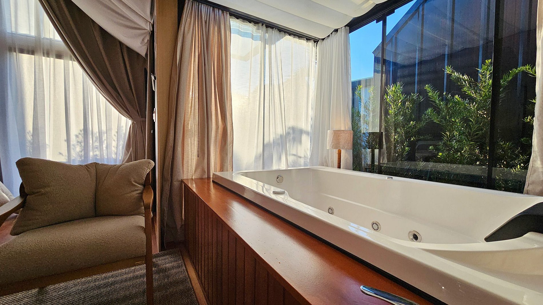 O teto e as paredes são revestidos por um tecido de linho, leve e elegante, que transmite a sensação de estar em uma tenda luxuosa no meio do deserto. A suave luz filtrada através do tecido das cortinas cria uma atmosfera de serenidade, perfeita para relaxar e recarregar suas energias.