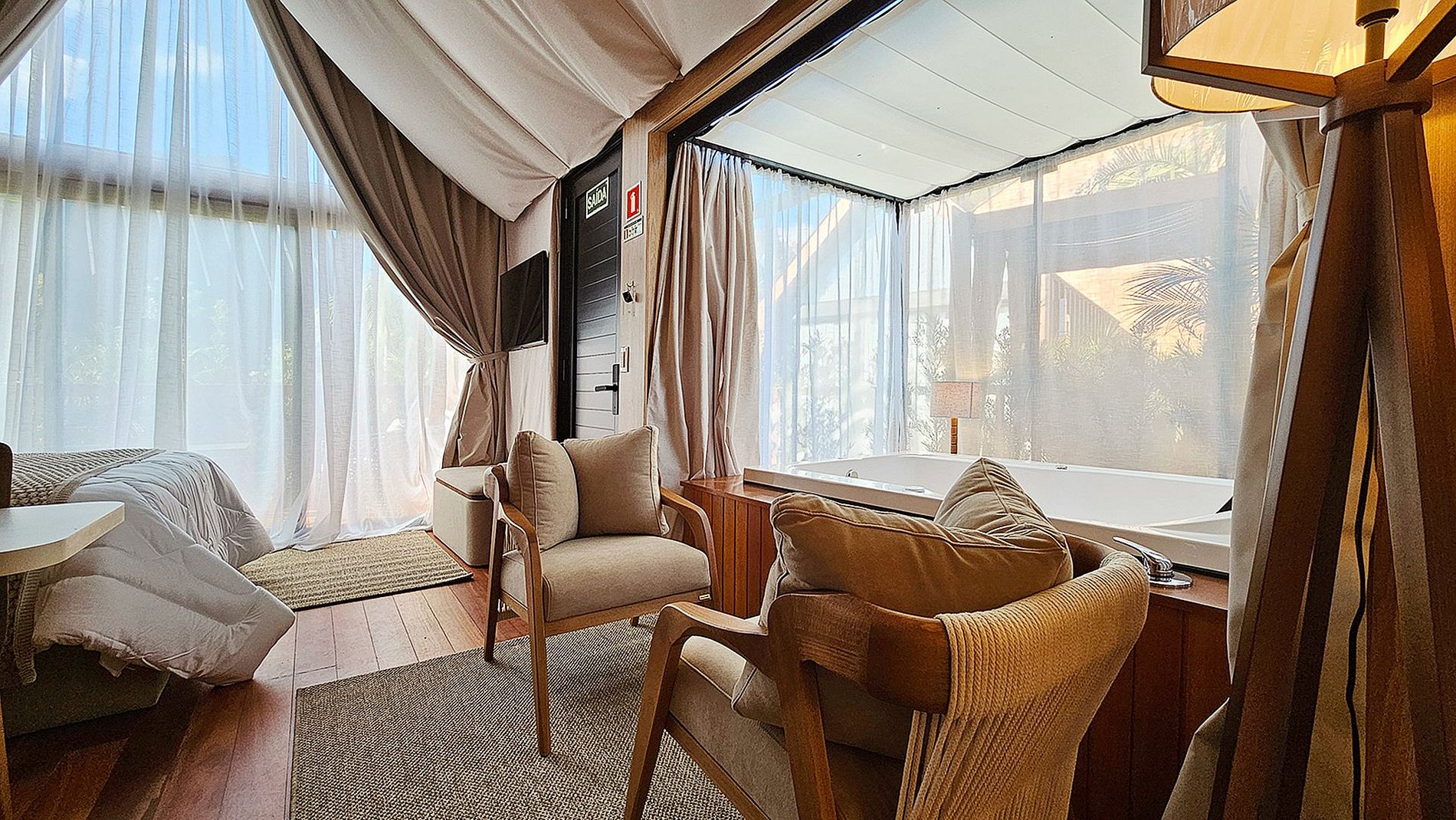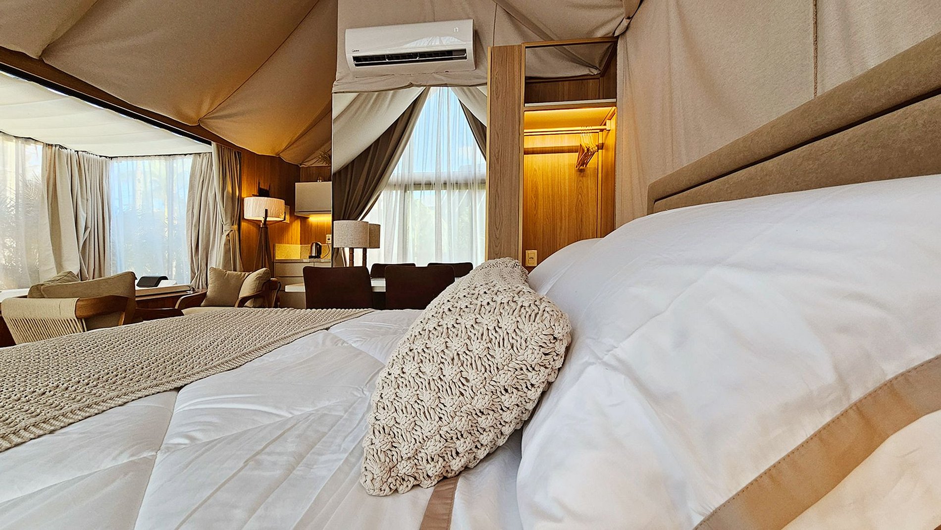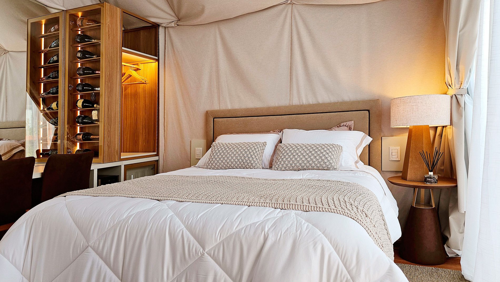 O teto e as paredes são revestidos por um tecido de linho, leve e elegante, que transmite a sensação de estar em uma tenda luxuosa no meio do deserto. A suave luz filtrada através do tecido das cortinas cria uma atmosfera de serenidade, perfeita para relaxar e recarregar suas energias.