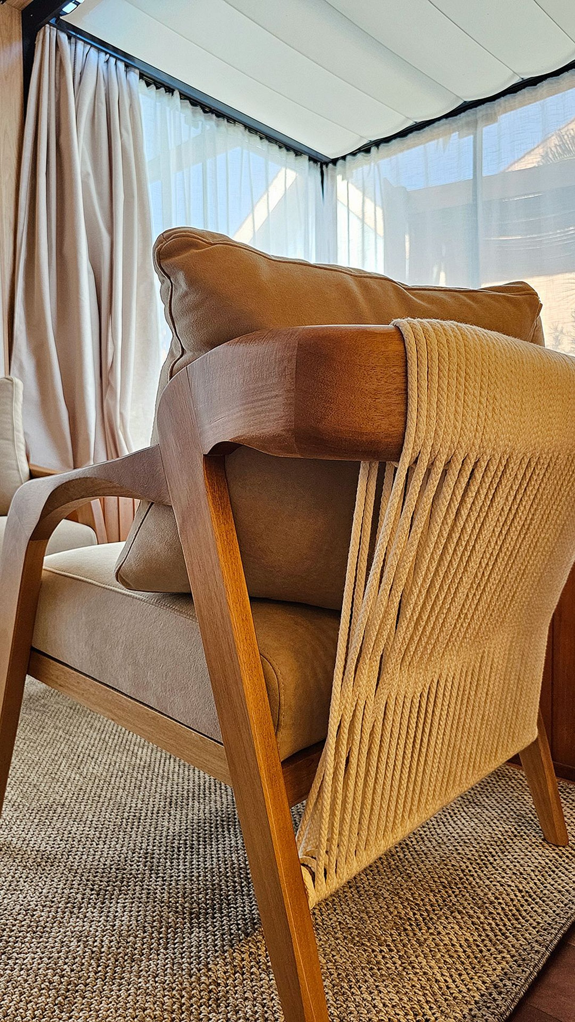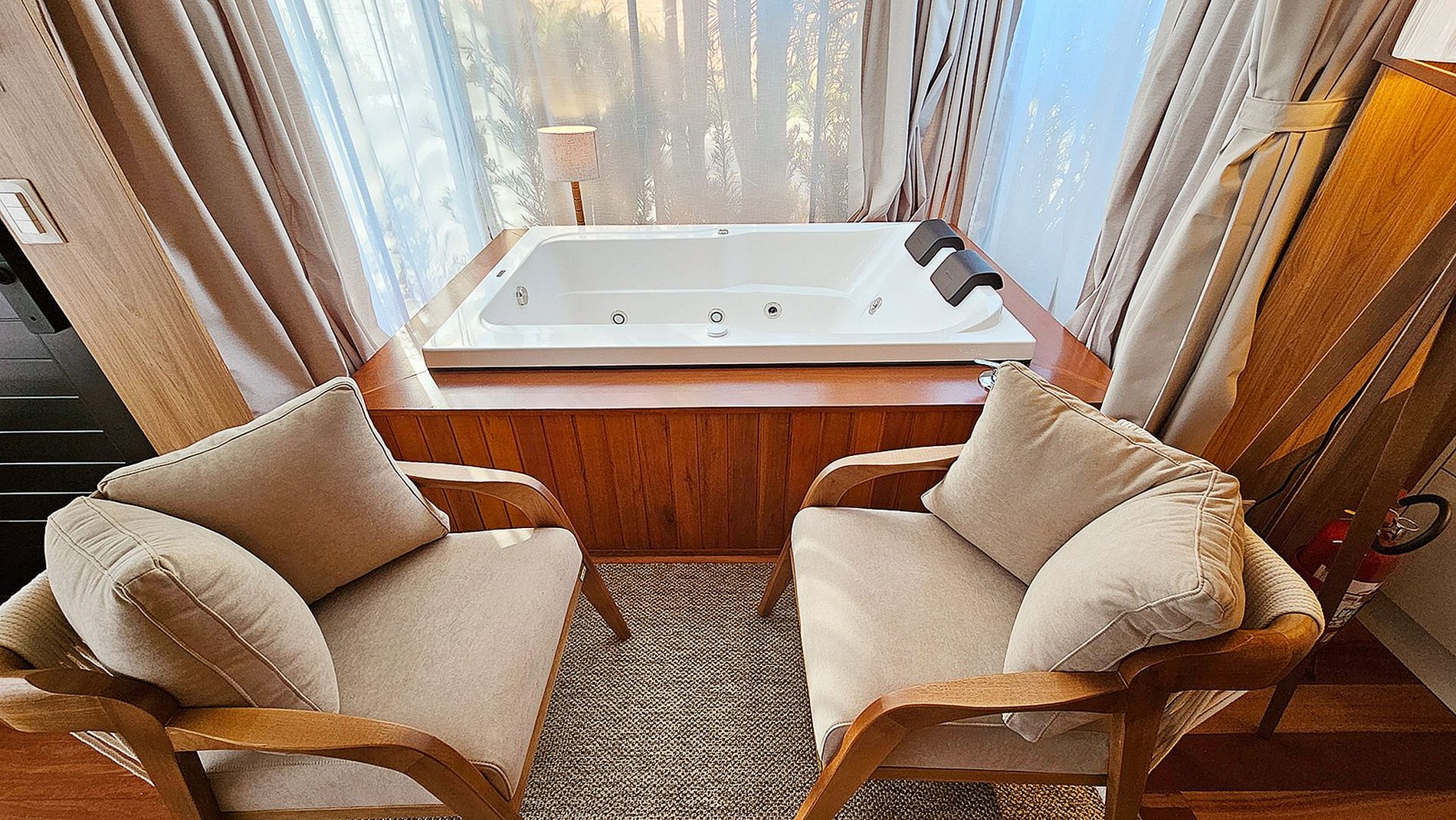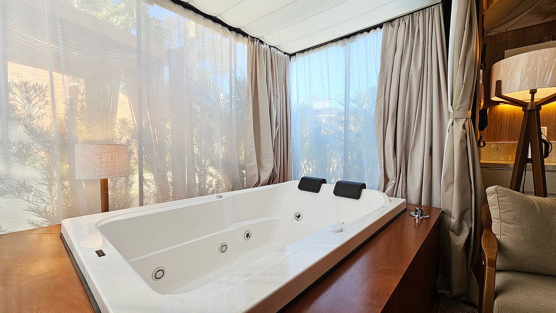O teto e as paredes são revestidos por um tecido de linho, leve e elegante, que transmite a sensação de estar em uma tenda luxuosa no meio do deserto. A suave luz filtrada através do tecido das cortinas cria uma atmosfera de serenidade, perfeita para relaxar e recarregar suas energias.