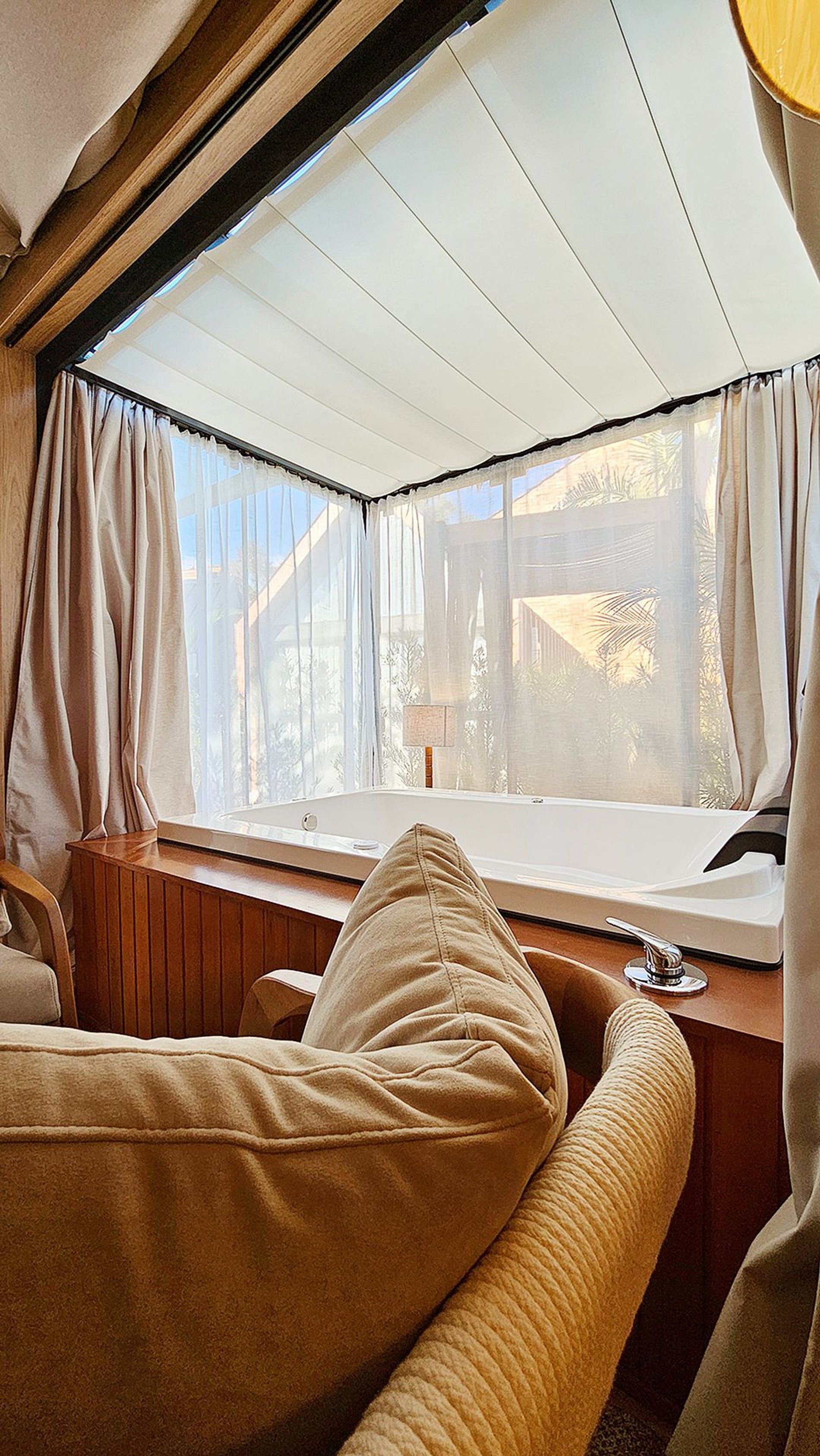 A cabana Ravello, é um verdadeiro refúgio que une conforto. Seu interior, revestido em tecido de linho, traz o charme das tendas do deserto, criando uma atmosfera exclusiva. As amplas janelas permitem que a luz natural inunde o espaço, enquanto a hidromassagem com cromoterapia transforma cada momento em uma experiência relaxante. O teto de vidro proporciona uma vista deslumbrante do céu.