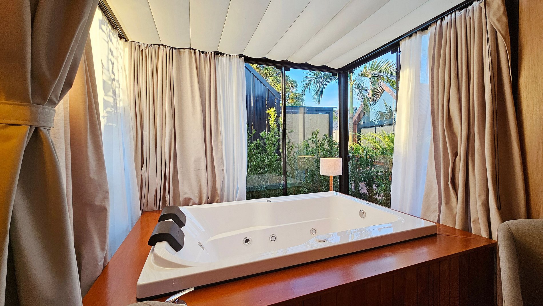 Dentro da cabana, você encontrará a peça central de luxo: uma hidromassagem espaçosa, convidando-o a mergulhar em um oásis de relaxamento. Deixe-se envolver pela água quente enquanto contempla as estrelas através do teto de vidro acima.