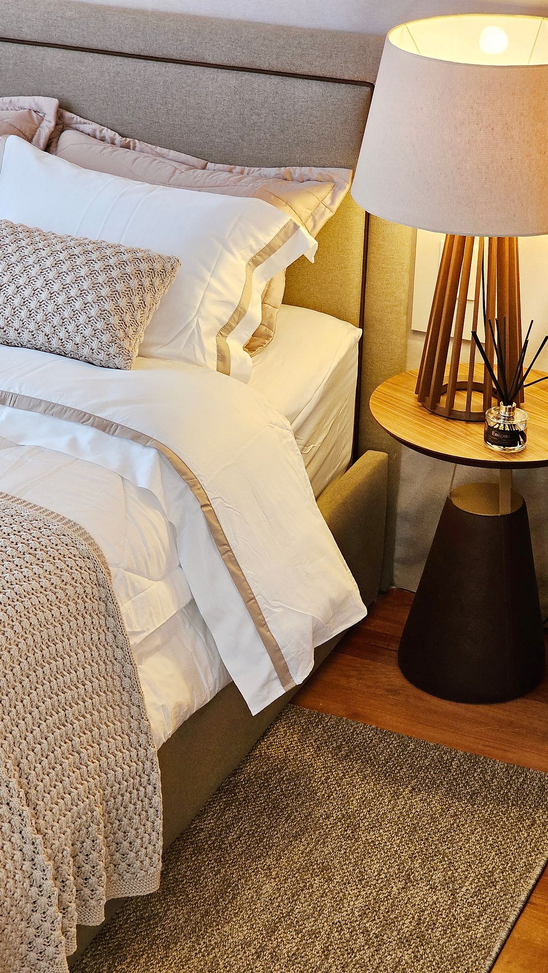 O teto e as paredes são revestidos por um tecido de linho, leve e elegante, que transmite a sensação de estar em uma tenda luxuosa no meio do deserto. A suave luz filtrada através do tecido das cortinas cria uma atmosfera de serenidade, perfeita para relaxar e recarregar suas energias.
