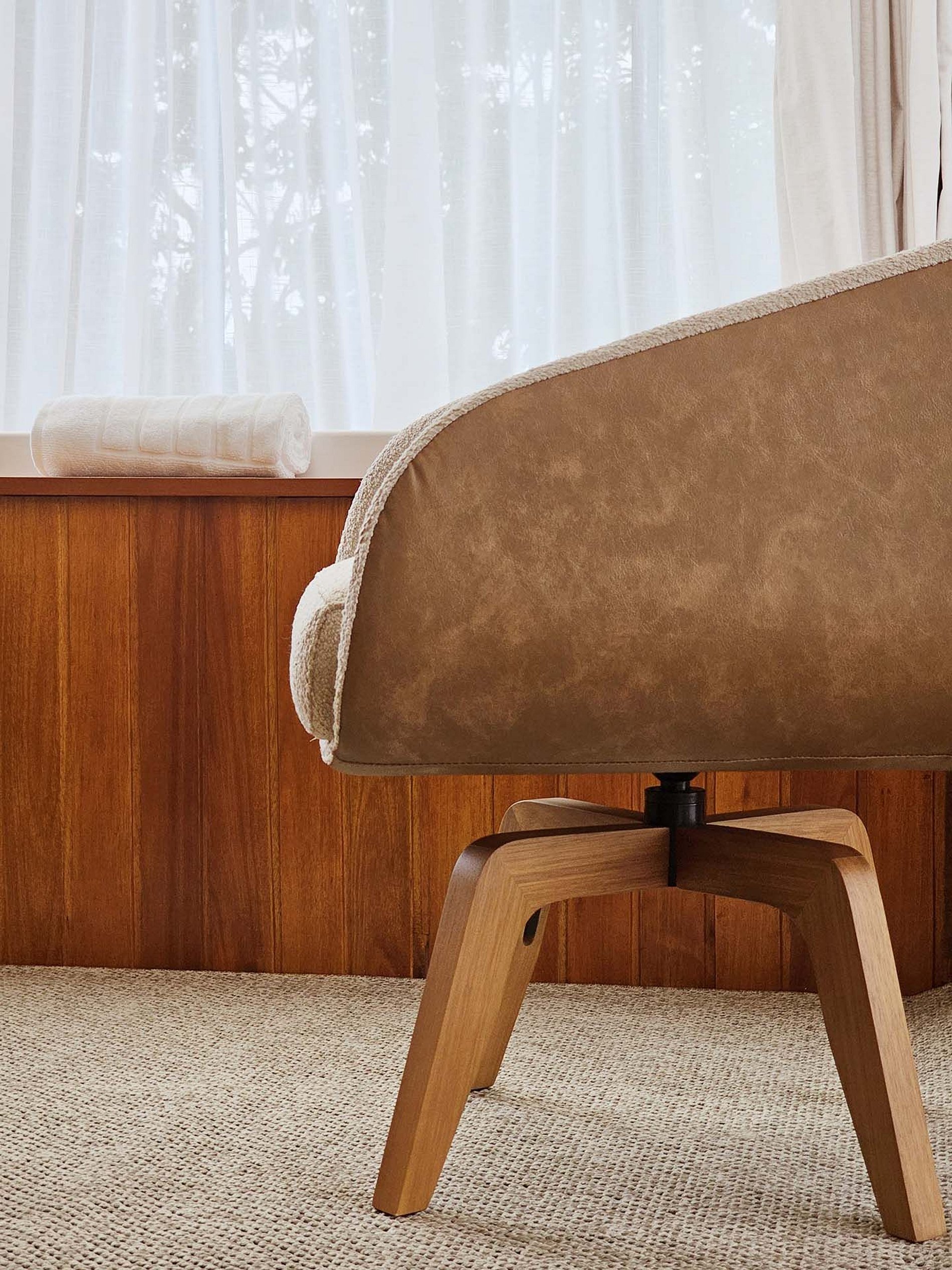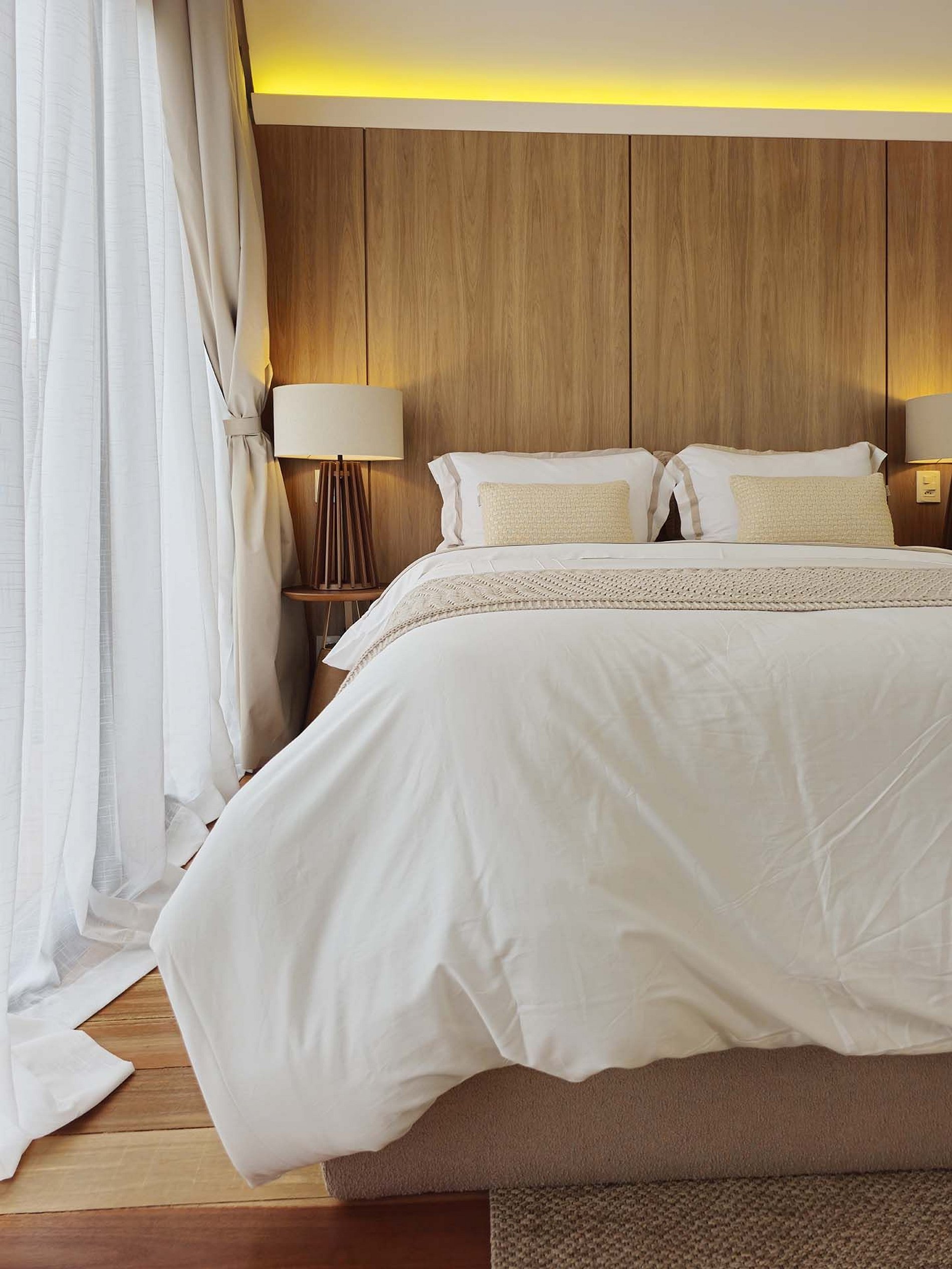 A sofisticação vai desde os detalhes da decoração ao mobiliário, que transmite a sensação de paz e aconchego. A suave luz filtrada através do tecido das cortinas cria uma atmosfera de serenidade, perfeita para relaxar e recarregar suas energias.