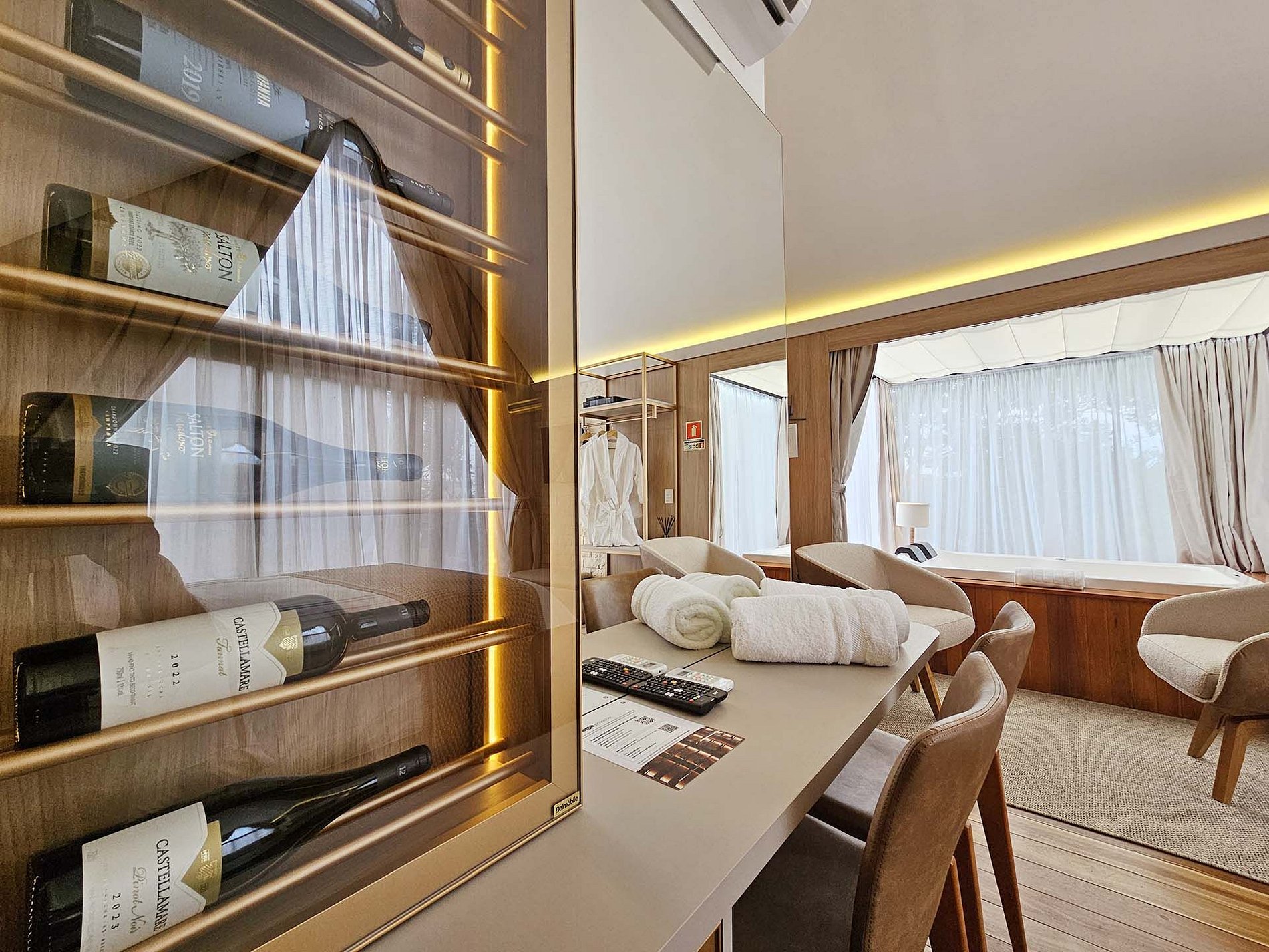 Para os apreciadores de vinho, uma surpresa aguarda dentro da cabana, uma adega interna privativa, cuidadosamente abastecida com uma seleção de vinhos finos. Desfrute de uma taça ao lado da pessoa que você ama, criando momentos memoráveis.