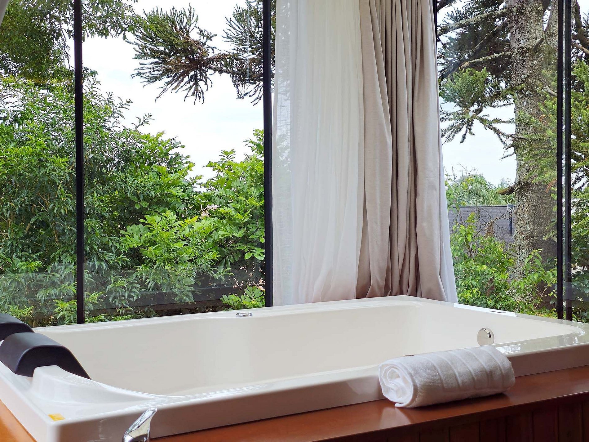 Dentro da cabana, você encontrará a peça central de luxo: uma hidromassagem espaçosa, convidando-o a mergulhar em um oásis de relaxamento. Deixe-se envolver pela água quente enquanto contempla as estrelas através do teto de vidro acima.